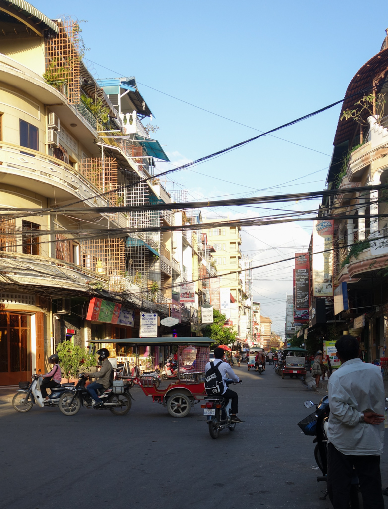 Phnom Pehn nous plaît, c’est une ville agréable. Bien sûr, il y a ici beaucoup plus de monde, et surtout beaucoup plus de circulation. Les tuk-tuks en pagaille nous accostent toutes les 5 minutes pour nous proposer leurs services. Cela aurait dû devenir agaçant… mais non! Aussitôt essuyé notre refus, les chauffeurs ne reviennent jamais à la charge et, souvent, s’arrêtent un moment pour discuter, échanger. Tous adorables.